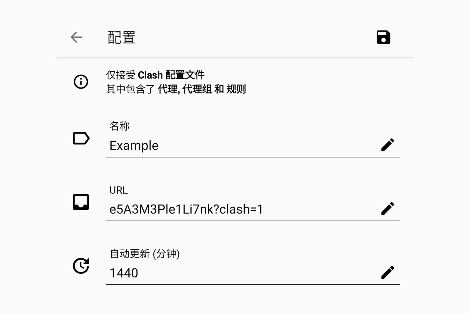 完成后点击右上角的 **保存** 按钮，Clash for Android 将下载配置文件，请点击 **选中** 添加的配置文件。