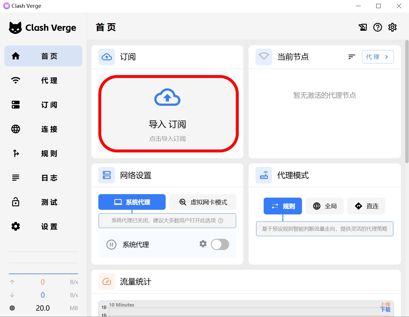 打开 Clash Verge Rev,在首页主内容区域左上角点击 导入订阅 。