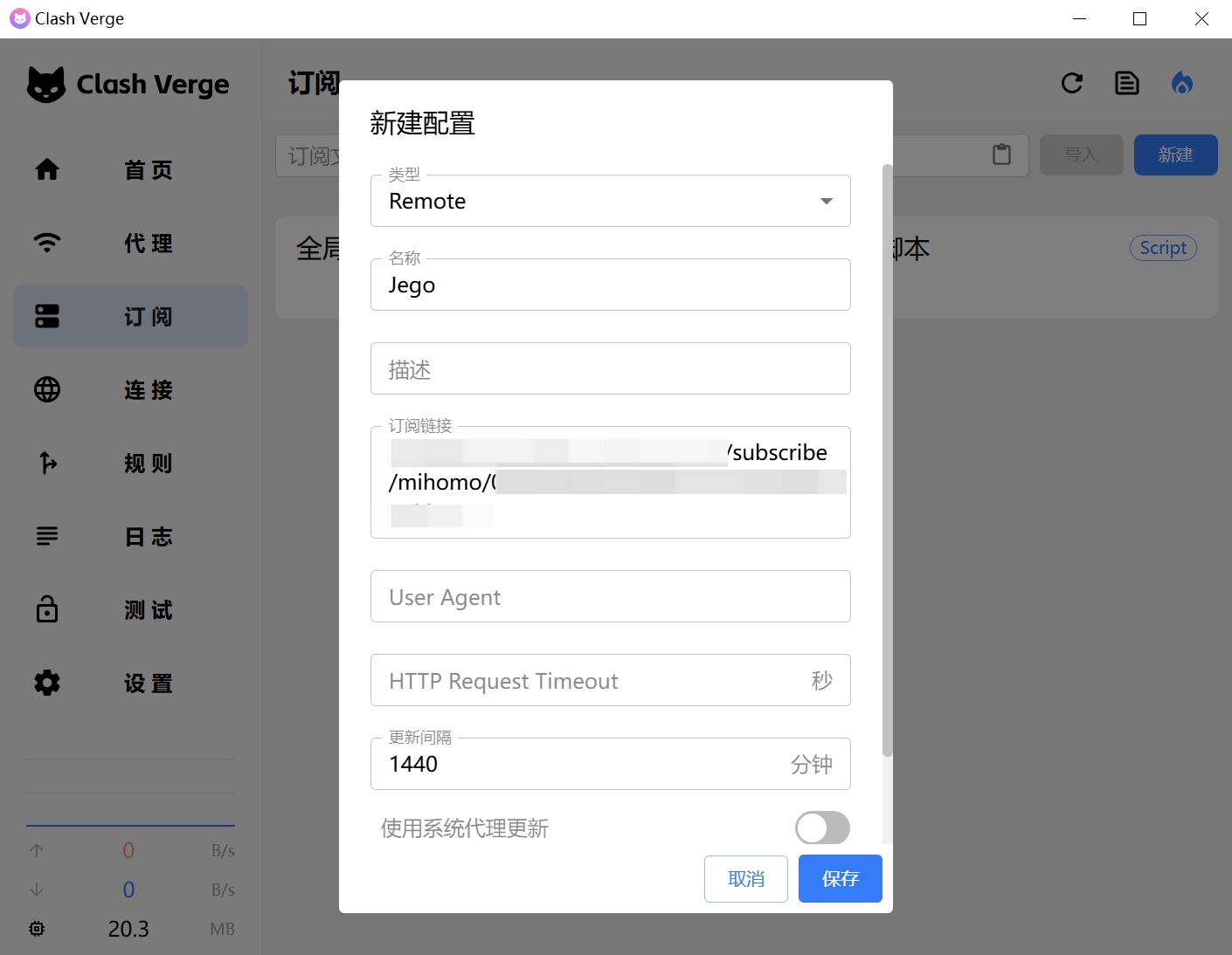 ,描述可以不填,订阅链接复制刚才从无忧行控制面板里复制的Mihomo订阅链接