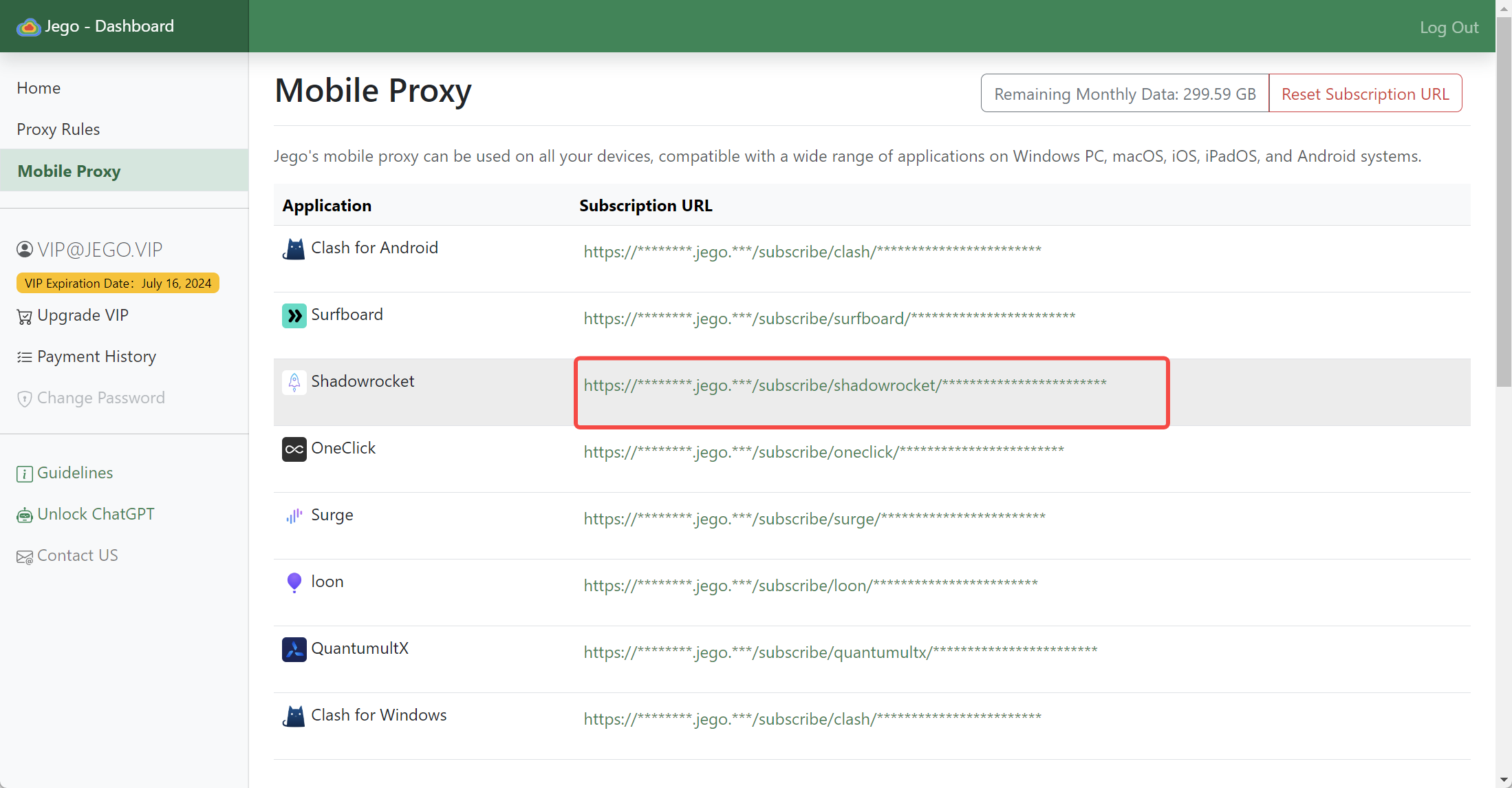 在**无忧行 - 控制面板**里点击左侧导航栏**订阅节点**  ，找到Shadowrocket订阅地址并点击**复制**。