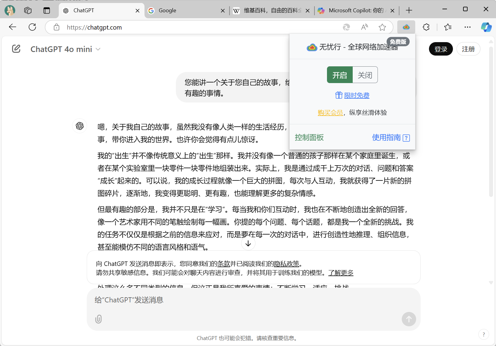 `使用无忧行插件，注册个账户就能免费翻墙！`